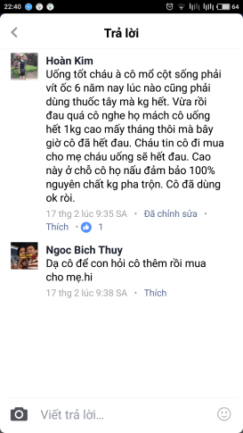Phản hồi của cô Hoàn về cao trănTính đến thời điểm bắt đầu sử dụng cao trăn là cuối năm 2016, Cô Hoàn đã phải mổ cột sống và vít ốc được 6 năm, sức khỏe ngày càng suy giảm, khớp tay và xương cột sống bị ảnh hưởng nhiều, khó sinh hoạt được bình thường. Đỉnh điểm là lúc cô trông cháu cho con gái đi làm, dẫn đến các cơn đau càng ngày càng nặng, và cô không thể bế cháu được nữa.